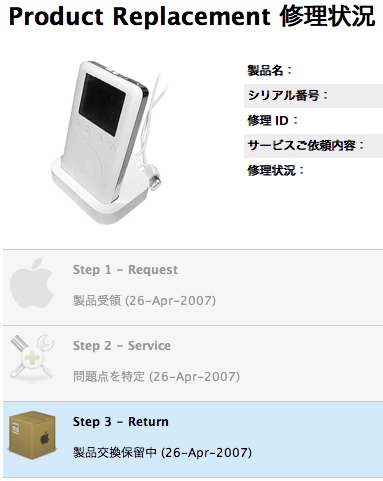 新型が出たら買おうと思い 早半年。出やしない。だどもバッテリーはへたる。で、iPod をバッテリー交換にだしたんだな。したら Apple から Mail が来て ステータを確認したら、製品交換保留中... なんじゃそりゃ?