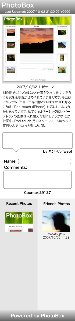iPhone & iPod touch & IE6 対応にも何とか目星はついたんだが... 中々時間が無いですなぁ。尻を落ち着けて始めちゃえば 1日で形に出来ちゃうんだけどねぇ。画像は iPhone & iPod touch 様のデザインだす。まだ変えると思うけどこんな感じかな。クリックで拡大します。