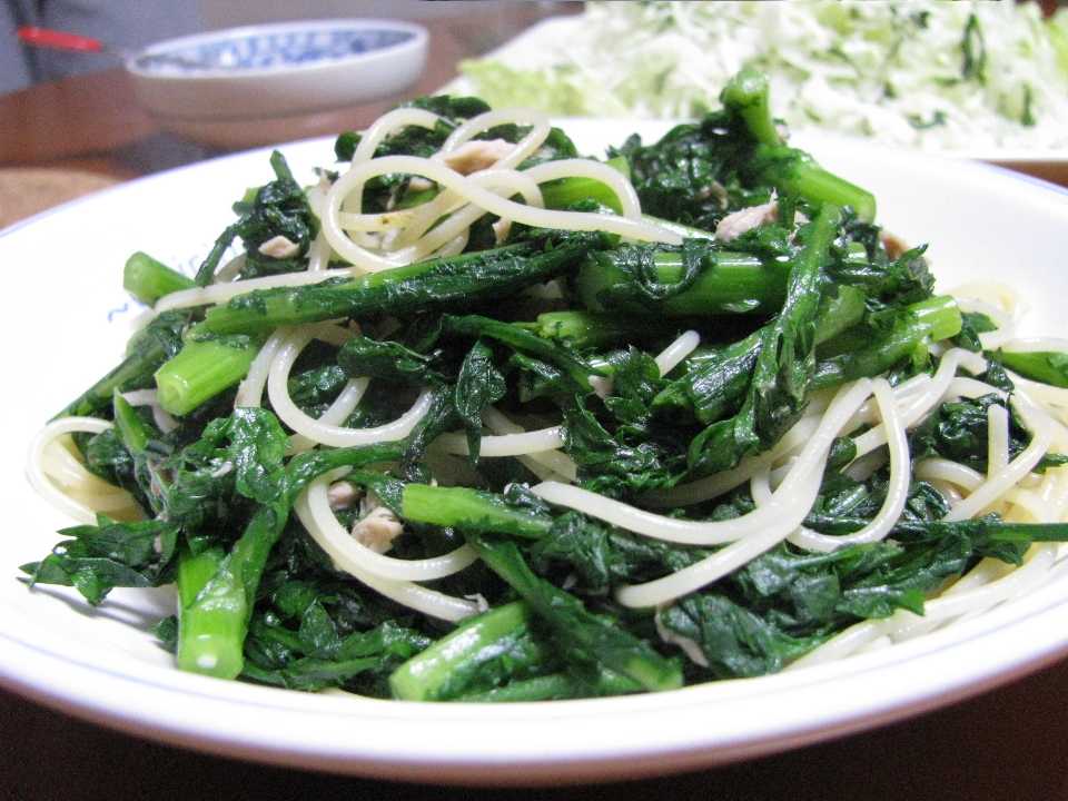嫁様の得意な春菊のパスタです。パスタを茹でる時の 上げる1分前くらいに春菊を入れ 一緒に茹で上げちゃって、ツナ缶と炒め 食べる時にポン酢をかけて食べるだす。これが美味いんだなぁ。だまされてと思ってやってみそ。